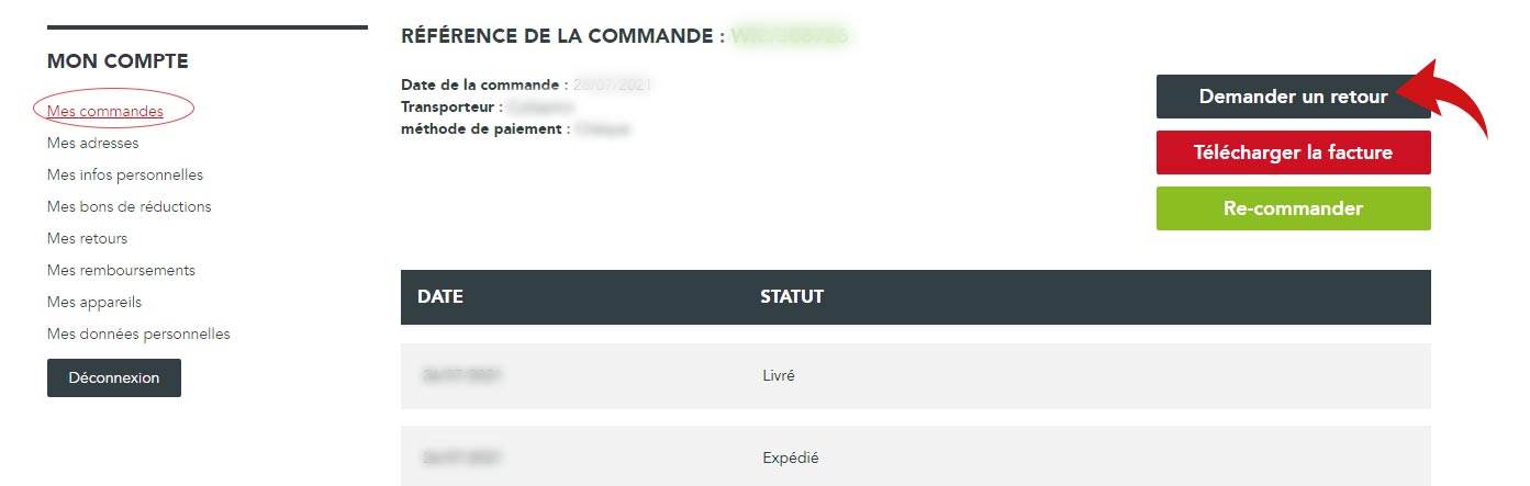 Il vous suffit pour cela, après réception de votre commande, de vous connecter à votre espace client et d’aller dans la rubrique « Mes commandes » puis d’utiliser la fonction « Demande de retour » dans la commande concernée. Ajoutez les détails et commentaires et nous traiterons votre demande pour valider le retour dans les plus brefs délais.